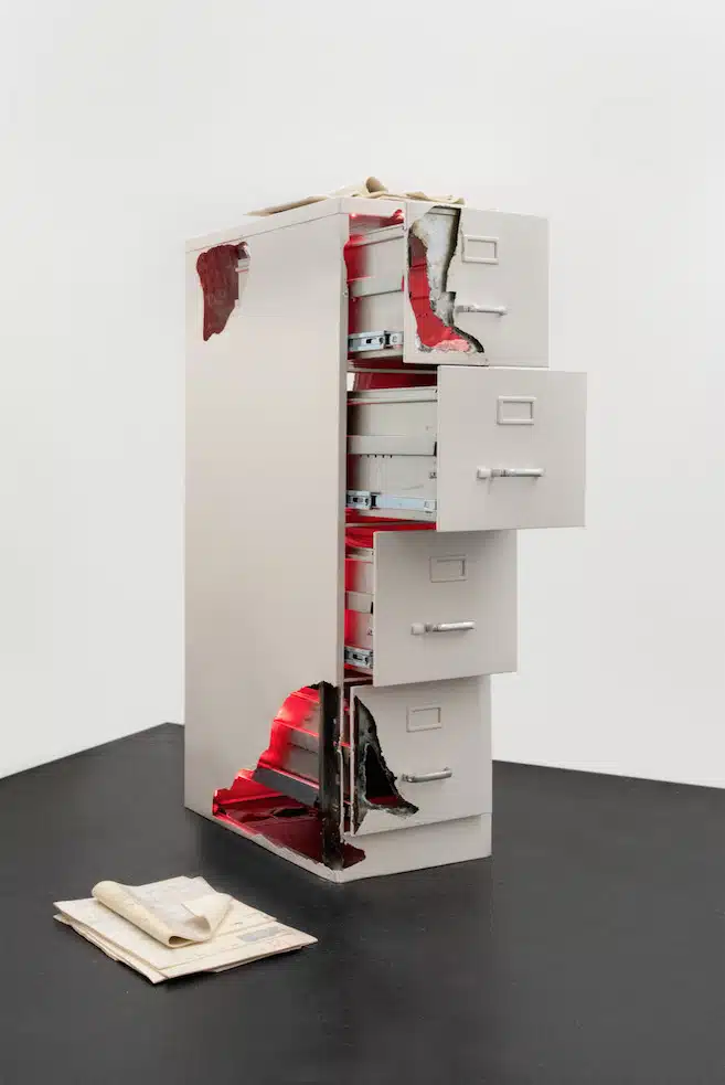 Networks of finance and ecology—and their collapse—are framed as the infrastructural condition behind a fractured middle-class American identity, with architecture (scaffolds, foundations, facades) serving as both metaphor and material logic for systemic precarity. The filing cabinet becomes a pre-cloud dispositif that spatializes time and value, while bentonite, fragmented porcelain “newspapers,” and an oil-price-driven red glow stage information leakage and commodity volatility as a critique of containment, order, and the inevitability of structural failure.