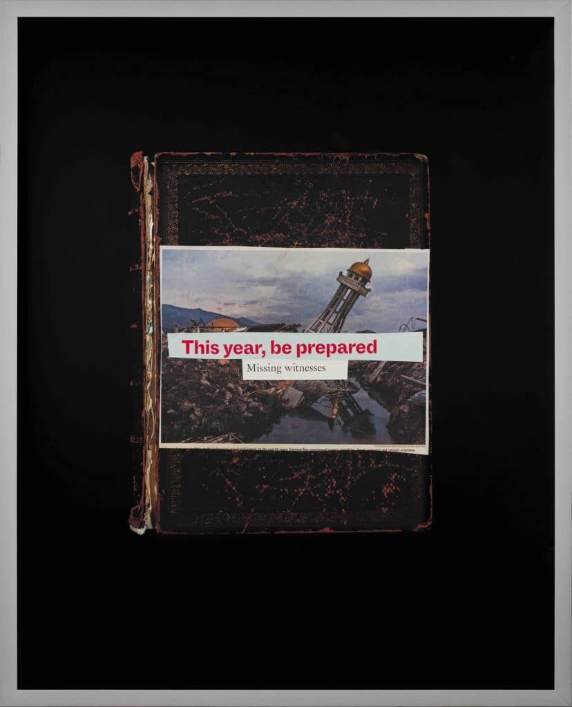 A layered collage sutures pandemic-era headlines and climate-disaster imagery to a nineteenth-century Hogarth volume, staging catastrophe as a recurring media-script that binds environmental collapse, political/religious control, and global struggles for racial, Indigenous, and trans sovereignty. By colliding popular news with canonical print culture, the work advances a decolonial critique of hegemonic modernity—exposing historical amnesia and complicity while showing how visual culture disciplines interpretation through capital, spectacle, and racialized narratives of crisis.